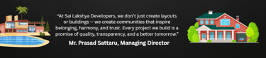 With over 15 years of experience in the real estate sector, Mr. Prasad Sattaru leads Sai Lakshya Developers with innovation, integrity, and a customer-first vision. His ethical approach and strategic leadership have shaped the company into one of Visakhapatnam’s most trusted real estate brands.